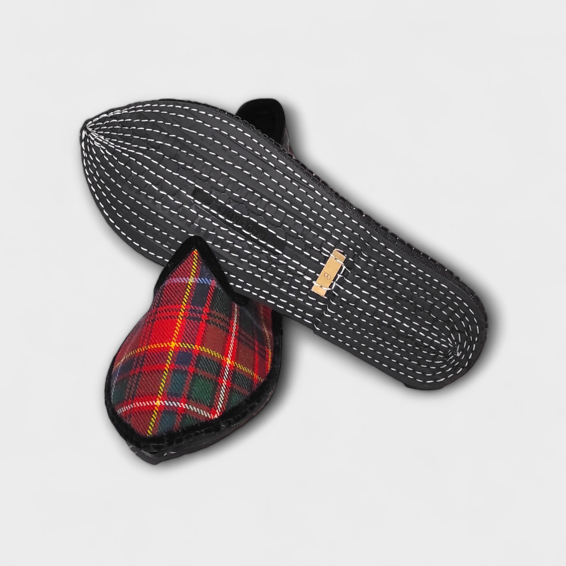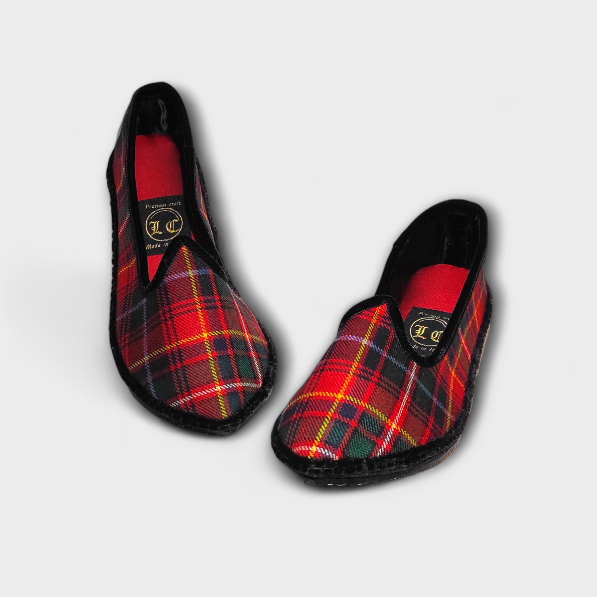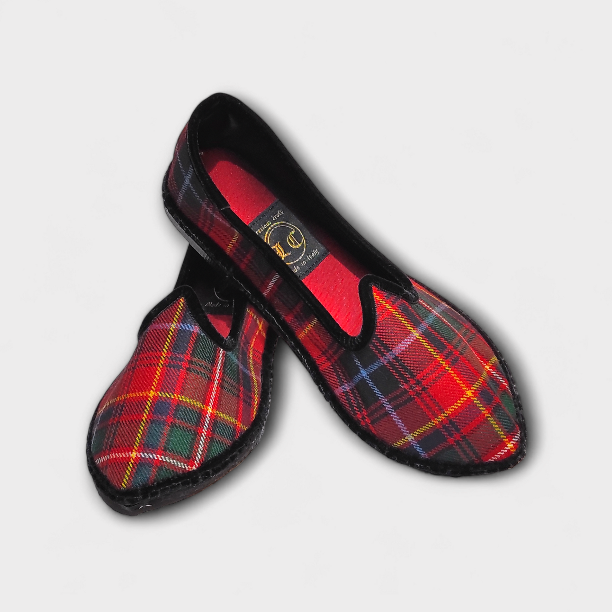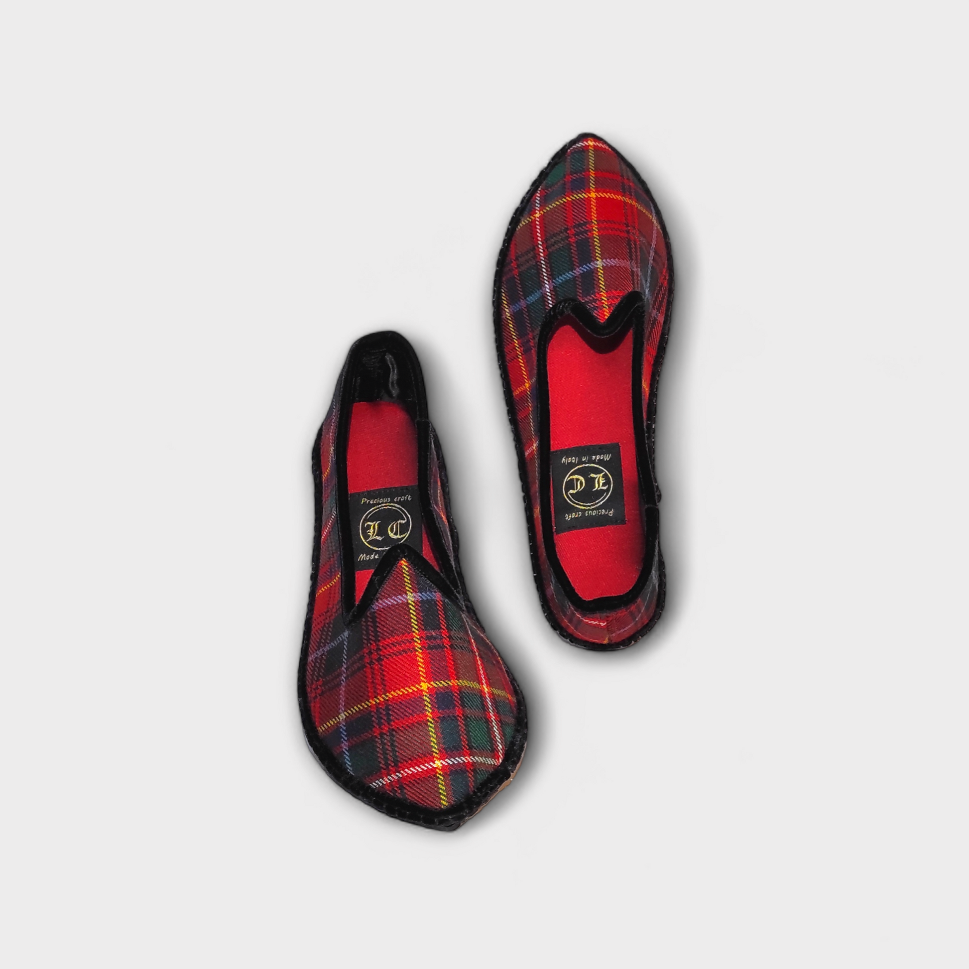 Scarpets artigianali, Made in Italy, in tartan di lana "tessuta nelle Highland scozzesi" con finiture in vellutina nera, foderati in raso di seta nero, sottopiede in duppion di seta rosso con soletta ammortizzata