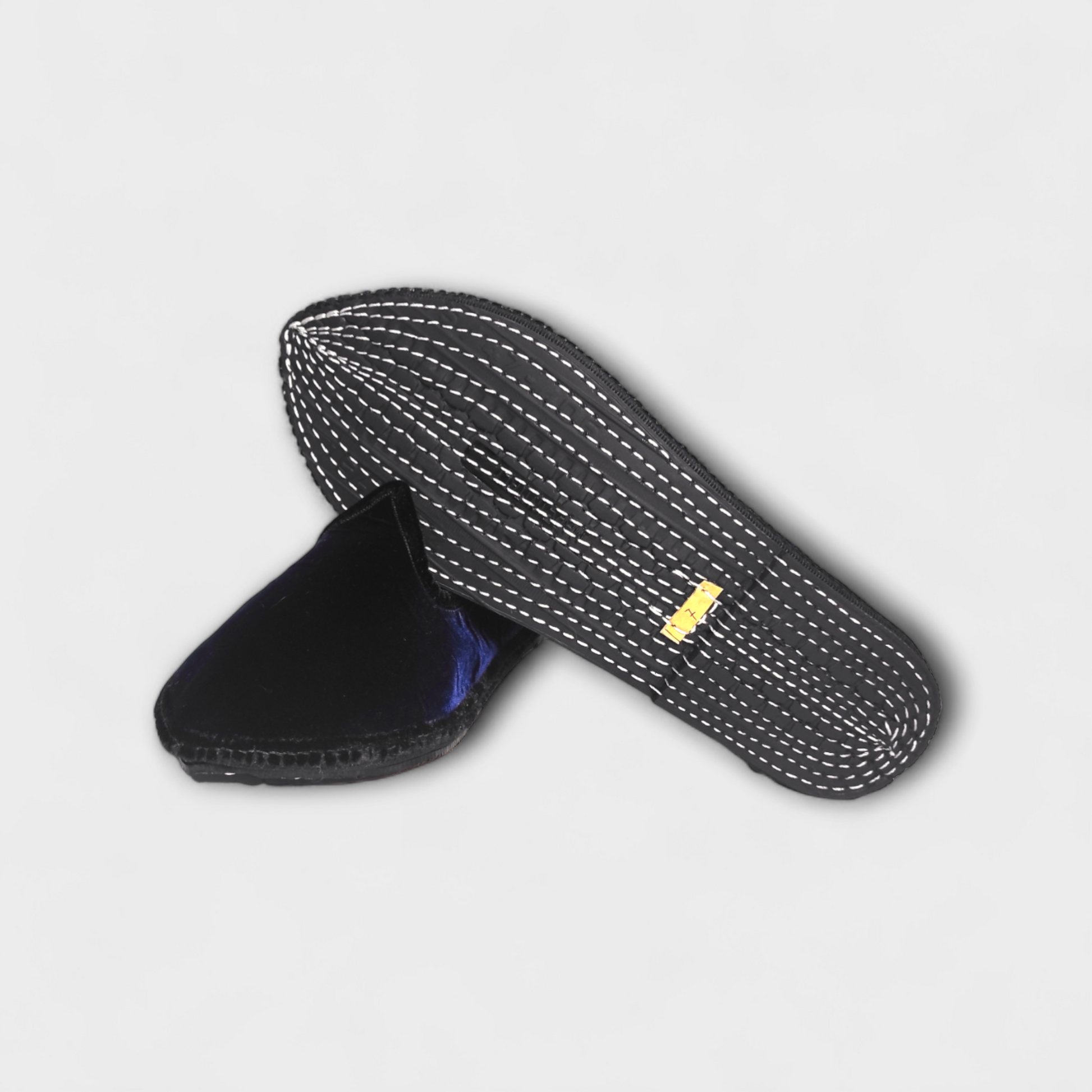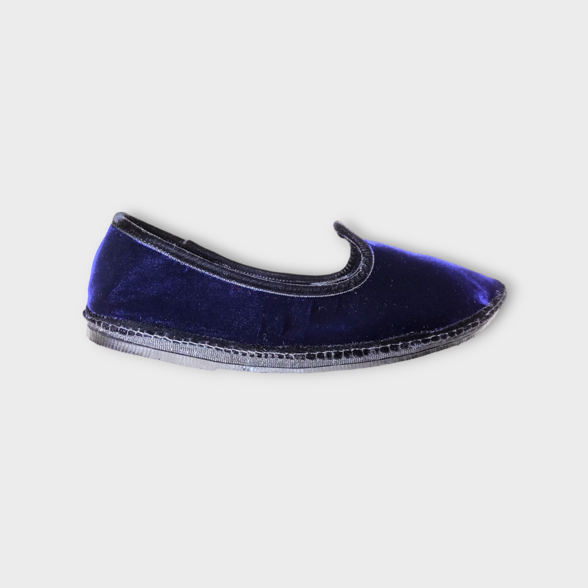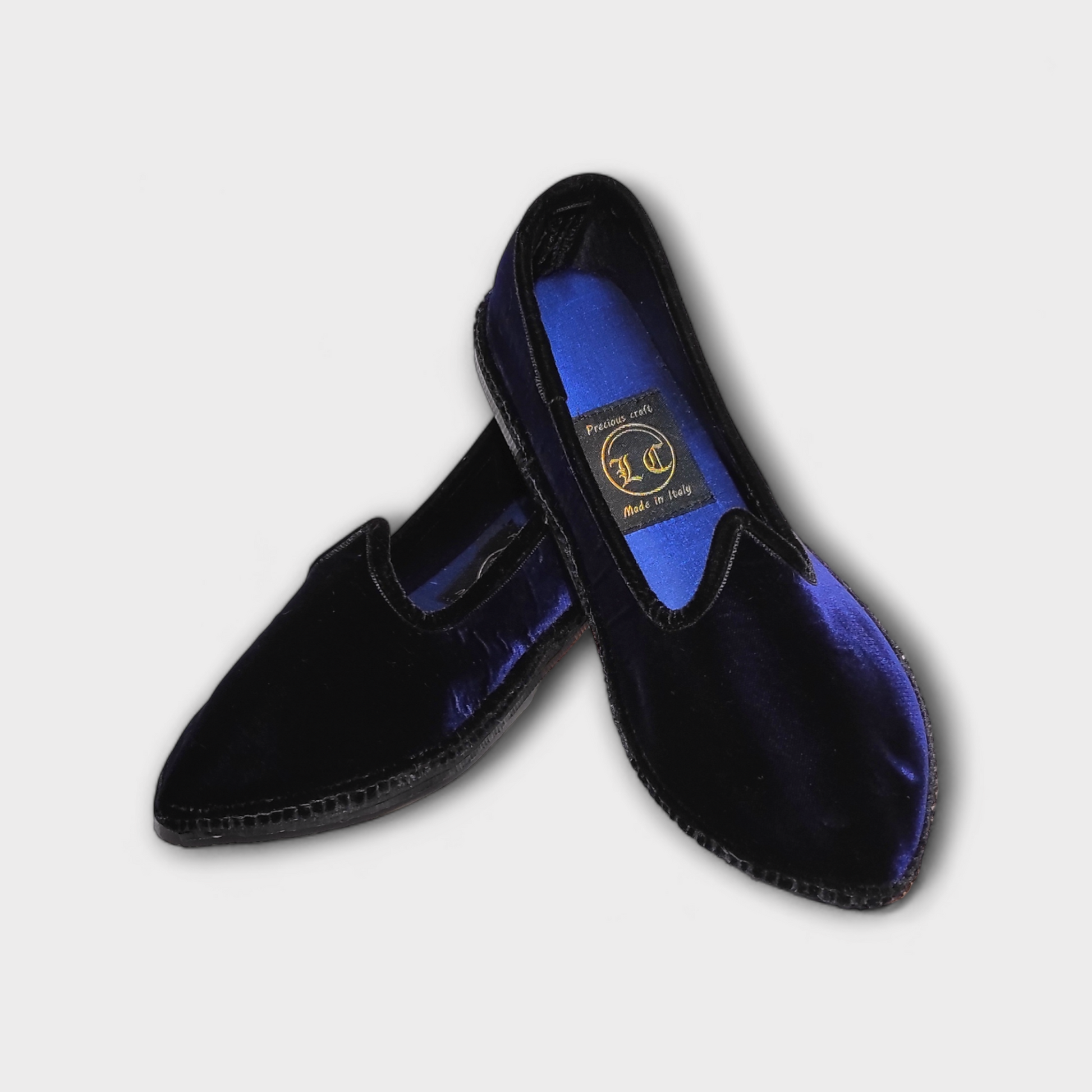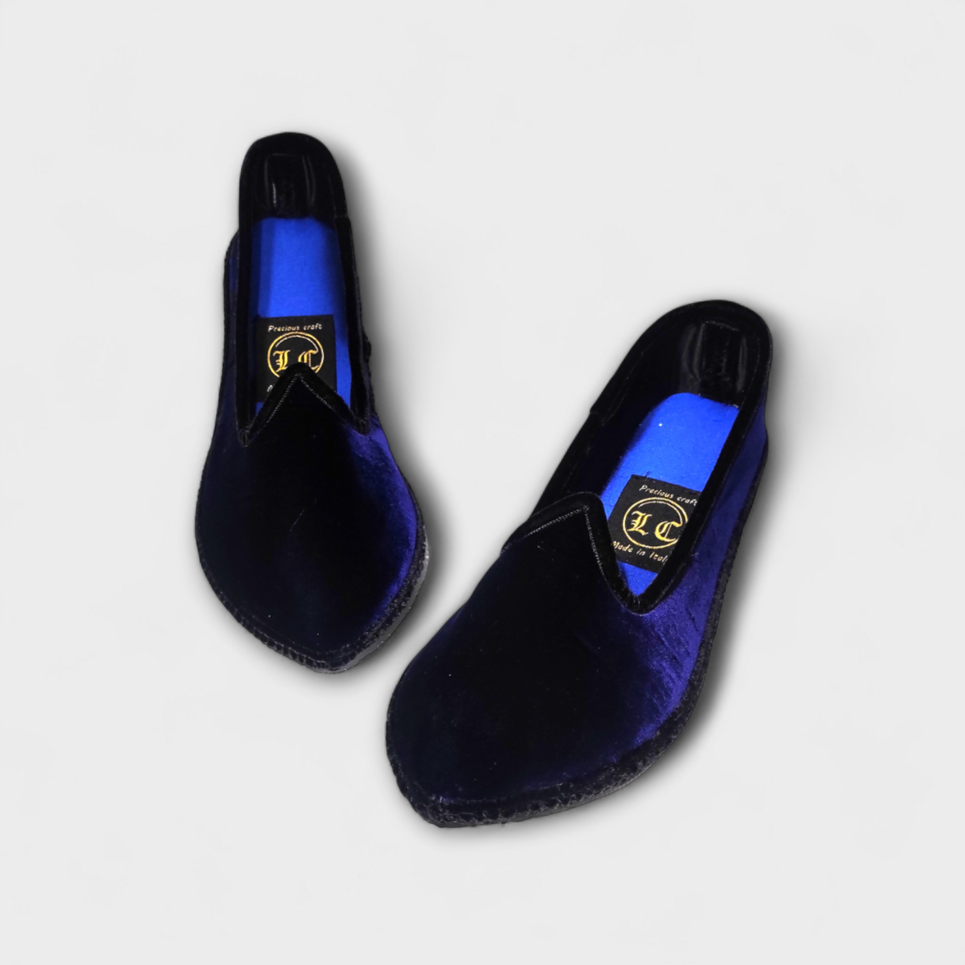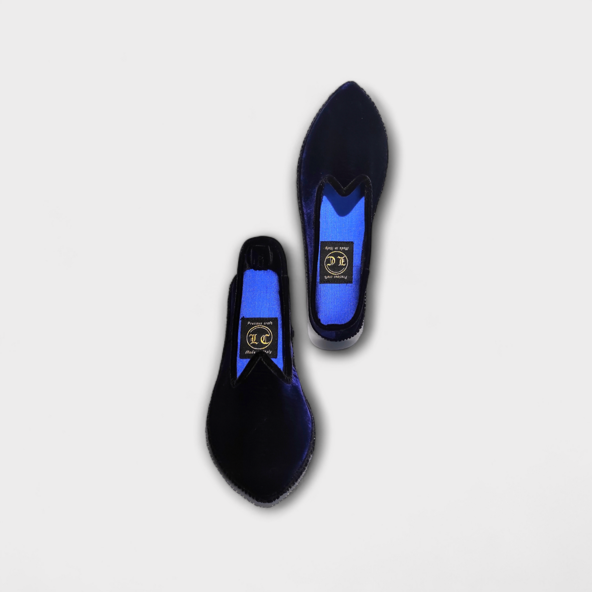 Scarpets artigianali, Made in Italy, in velluto di viscosa blu notte cangiante "collezione Valli Milano" con finiture in vellutina nera, foderato in raso di seta, sottopiede in duppion di seta turchese con soletta ammortizzata