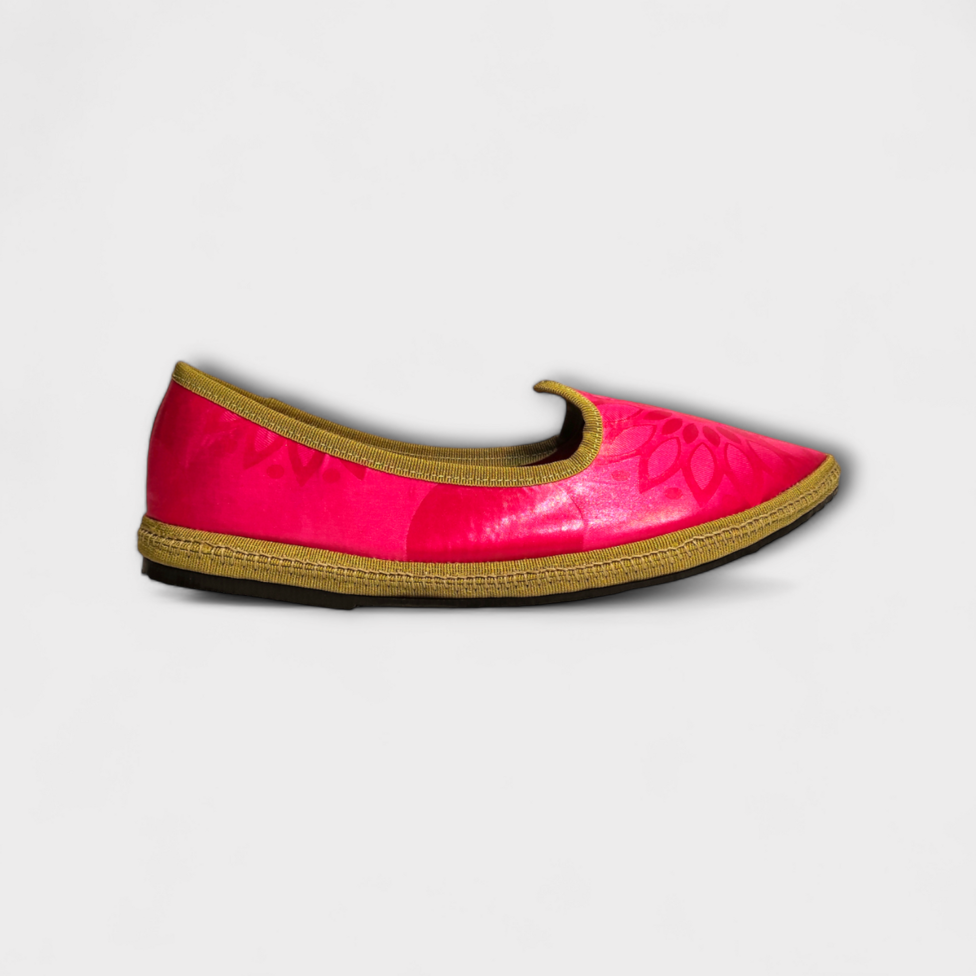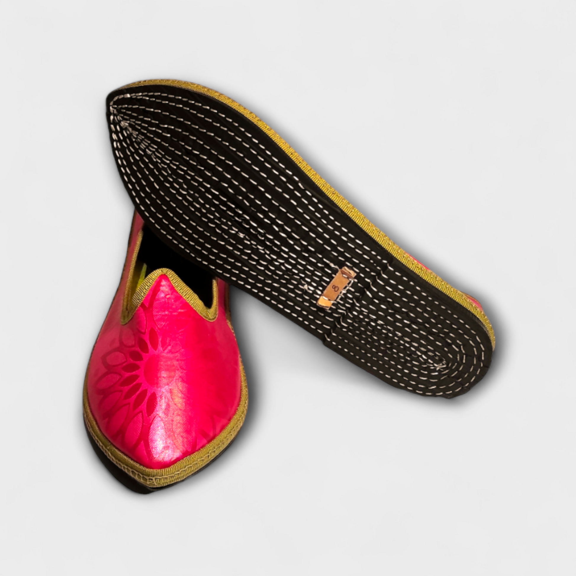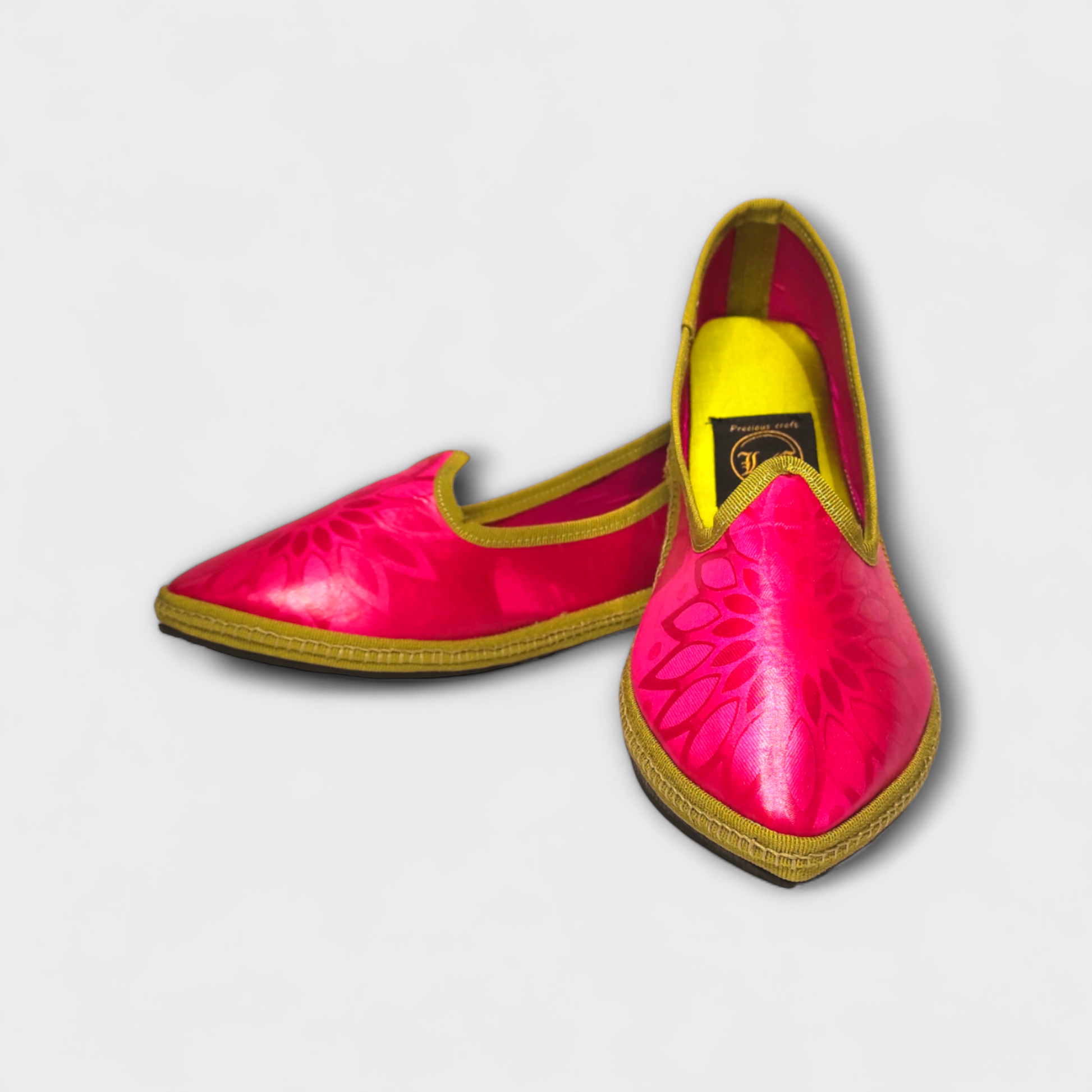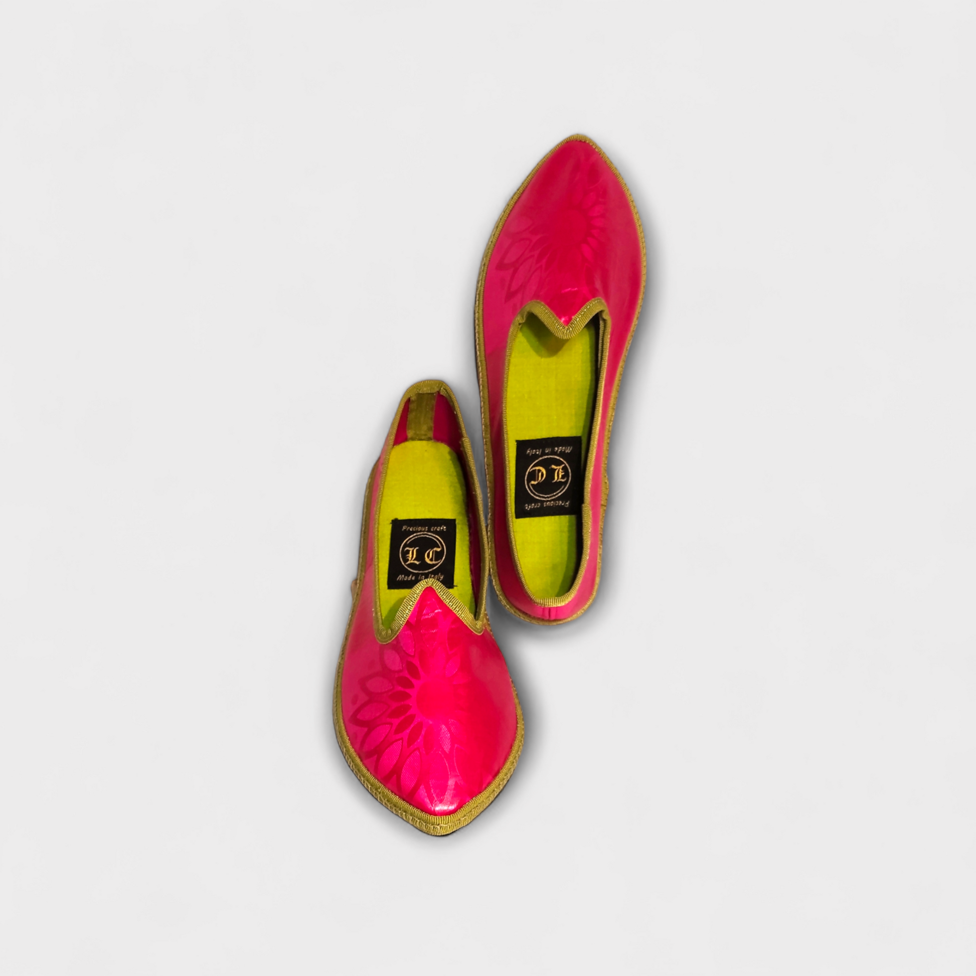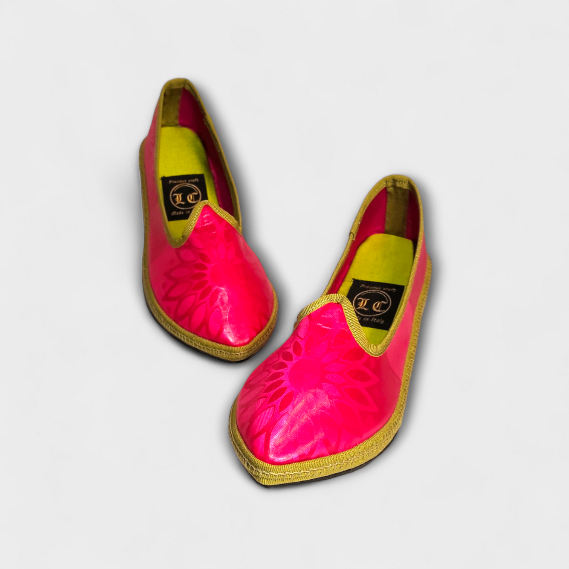 Scarpets artigianali, Made in Italy, in puro cotone africano rosa intenso con finiture in grosgrain lime, foderati in raso di seta rosa intenso, sottopiede in duppion di seta lime con soletta ammortizzata.